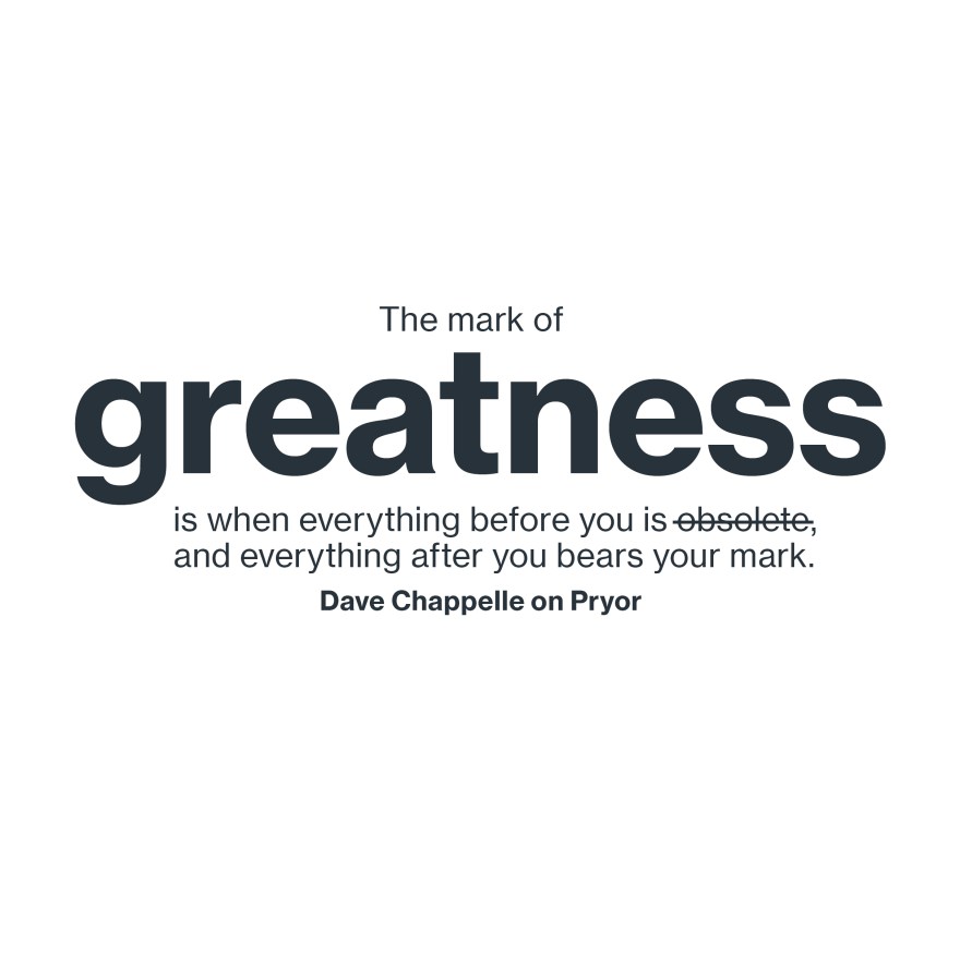 Richard Pryor indeed left a mark, a legacy he created in his stand-ups, acting and benevolence to his community. His uproariously funny jokes is what many aspire to pull-off, living the audience gasping for air in what seemed like their rip was going to explode in laughter. We all have marks that we all aspire to bear or leave behind, our geniuses may be flawed, but for every magnanimity, smile, or rib we seek to crack with laughter, every step we take in that direction is applaudable.