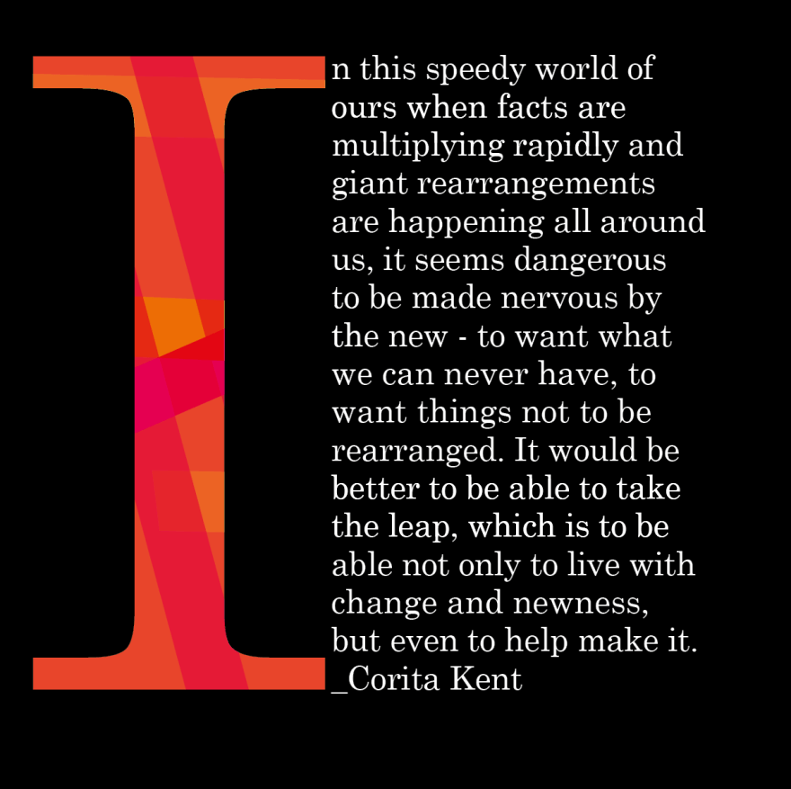 “In this speedy world of ours when facts are multiplying rapidly and giant rearrangements are happening all around us, it seems dangerous to be made nervous by the new – to want what we can never have, to want things not to be rearranged. It would be better to be able to take the leap, which is to be able not only to live with change and newness, but even to help make it.” _Corita Kent